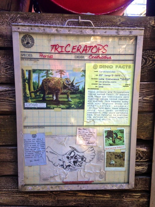 The story plays out on several levels, and you can decode it by simply looking around and paying attention to the details. First, you’ll notice that this is very clearly a paleontological dig site, with the fossils of dinosaur bones exposed in the various layers of earth that have been deposited over millions of years. If you take a few moments to study the (fake yet very realistic-looking) rock formations, you can clearly make out the different layers or “strata” in which the fossils have been trapped.