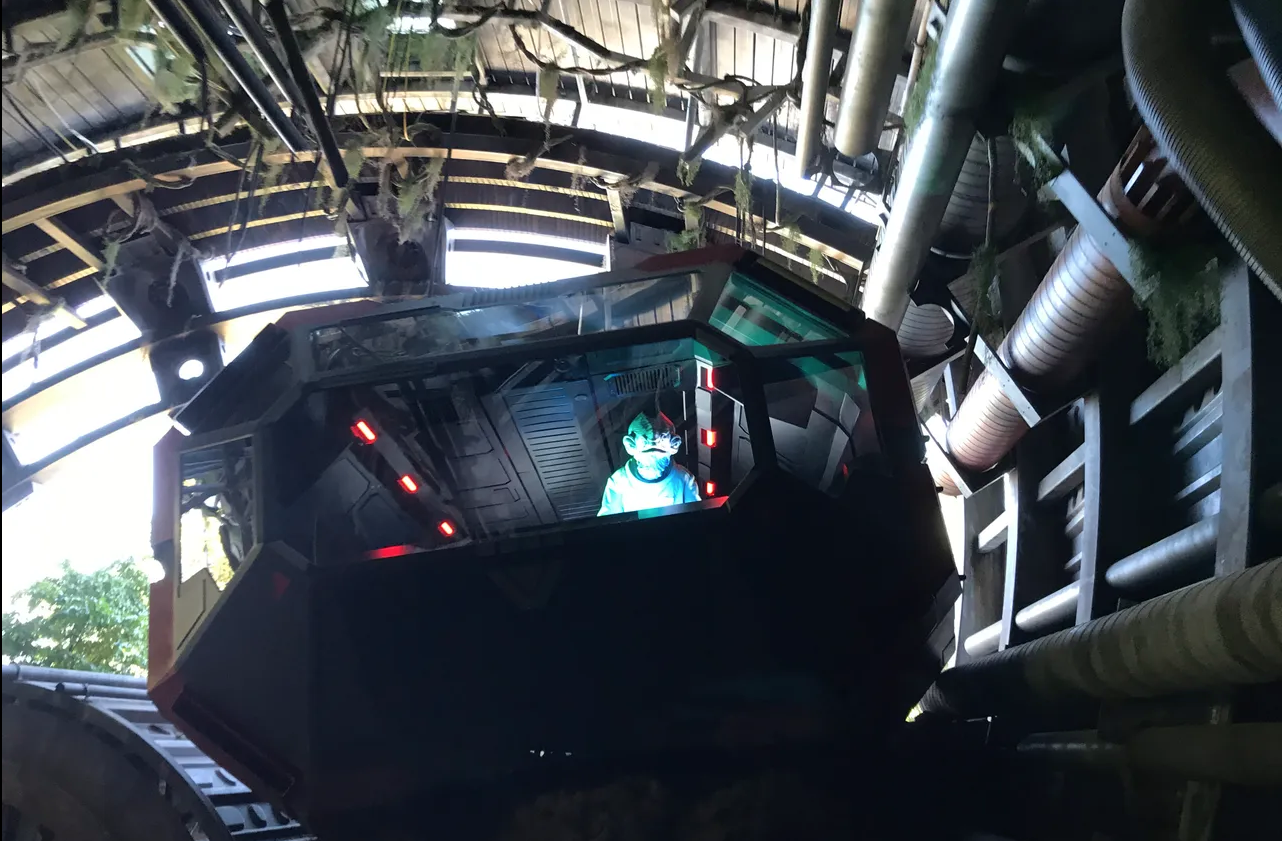 Guests are standing in a vehicle (which moves!) headed from Batuu to the other Galaxy’s Edge. Poe, Finn and several other characters make appearances with an incredibly lifelike Lt. Bek (who says the best thing, ever) driving the vehicle. But, oh no! Disaster! The First Order has found the vehicle and is taking everyone onboard as prisoners!!!!