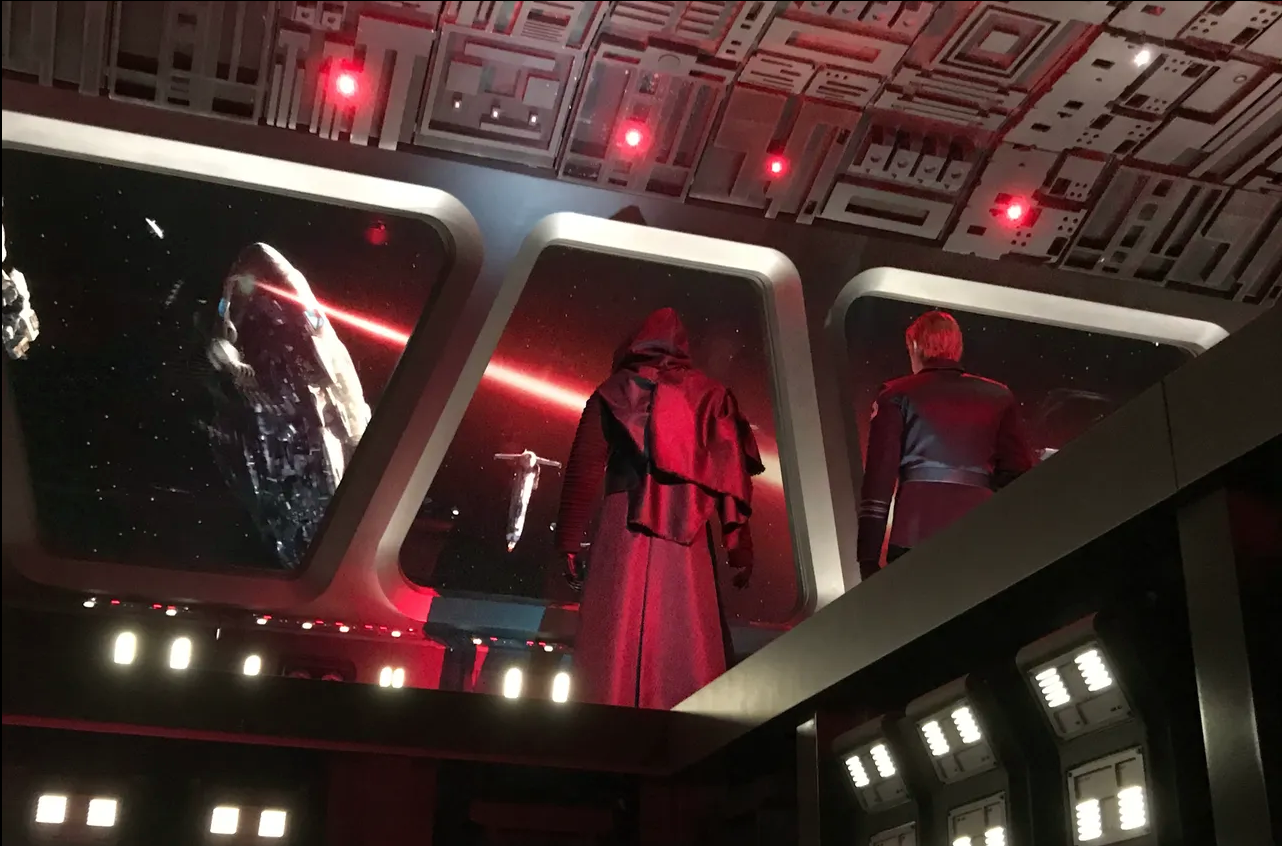 A horde of storm troopers, standing in formation, most of which are animatronic. This sight alone will bring the most die hard Star Wars fan to tears. Then as prisoners wait to be interrogated, they are formed into lines aboard the Star Destroyer. We waited in our designated area..: Kylo Ren made his first appearance and then… Huzzah! Escape! The Rebel Alliance has found us and has a plan!