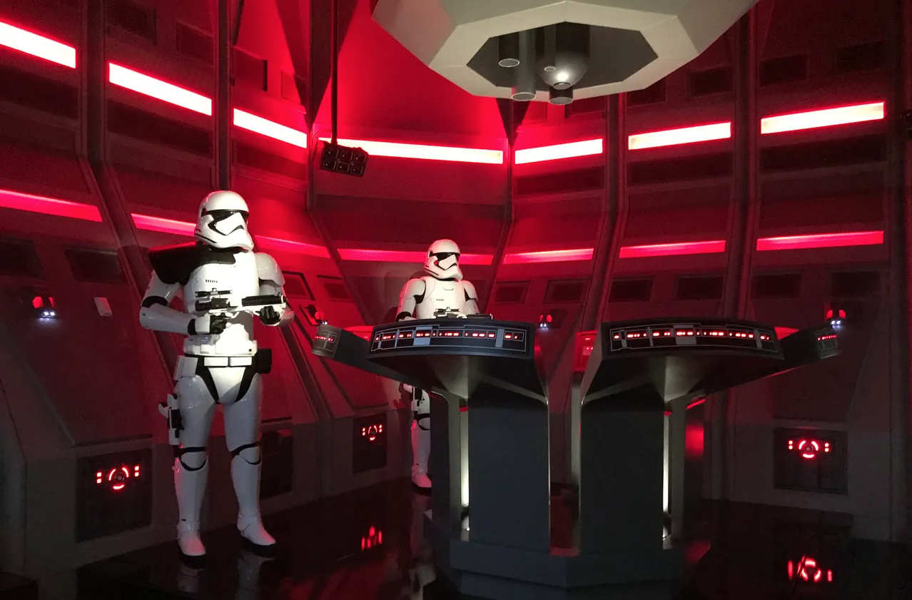 Two Stormtroopers stand watch as Resistance prisoners are moved to their holding cell inside the Rise of the Resistance ride at Disney’s Hollywood Studios.