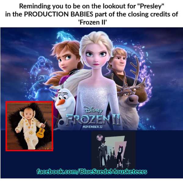 It is tradition now at the end of a Disney movie to add the names of all babies born while the movie was made. Because of my obession with Elvis Presley, Disney, and how excited I get when my worlds collide, you can imagine my excitement about this. Somebody on the production team of Frozen 2 named their new baby “PRESLEY”