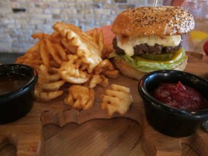 My daughter Emily had the Q Burger with pepper jack cheese and cross cut fries. This burger was huge – definitely big enough to be shared -and it came out cooked to perfection!