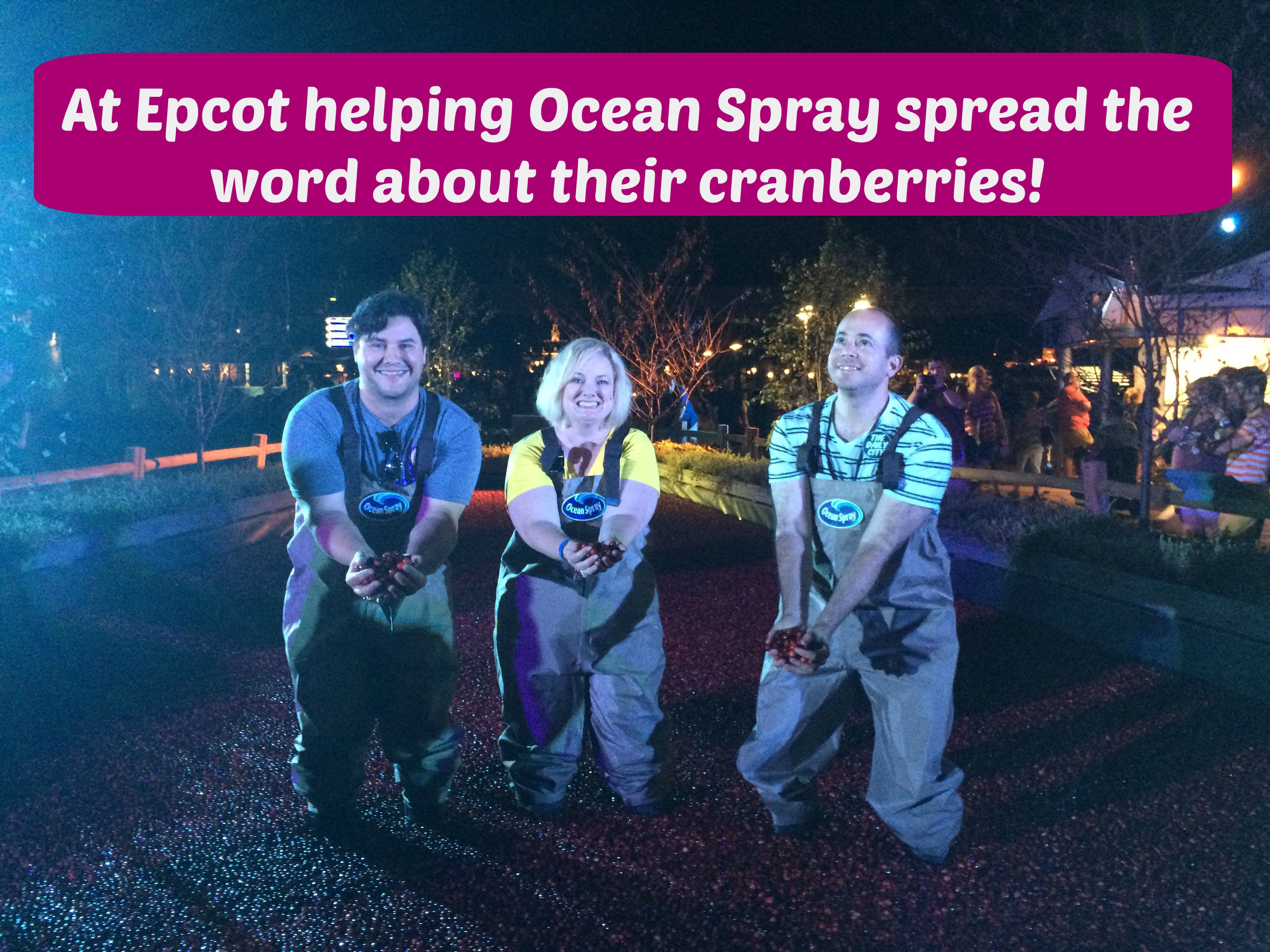 A couple of days, a few emails and texts later – thanks to the generosity of Ocean Spray – I find myself right in the middle of my cranberry dream becoming actual reality. Only it was better, because when the time came, my two friends decided to join me. The only thing better than an Epcot cranberry bog dream come true…is to get an exclusive experience of the magic with a couple of friends. Other than the Disney cast members and the team from Ocean Spray – we were the only ones inside the bog. Mark (far right) was a little hesitant at first – but I was encouraging him, and so was Sharon from Ocean Spray. I will never forget the way he looked at her and said, “OK – but can I go with HER?” I’m so proud to think maybe my dreams are a little contagious.